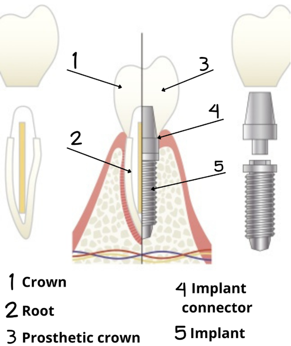 - The implant – a titanium screw surgically inserted into the patient’s bone, where it integrates with the bone and functions as a tooth root.